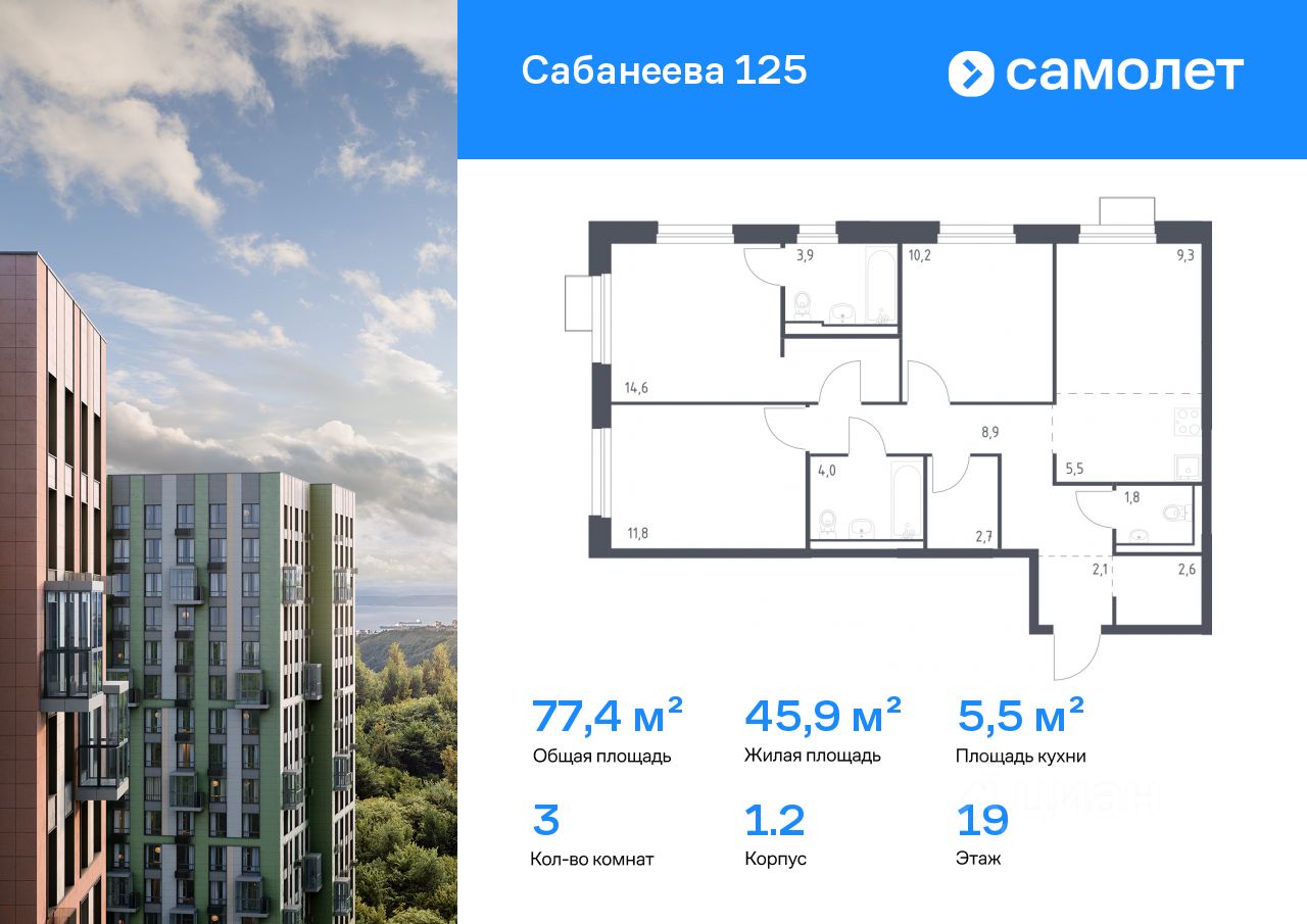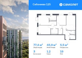 Строим кварталы для жизни с заботой о будущем. Предлагается 3-комнатная квартира комфорт-класса 77,4 кв.м в корпусе 1.2 на 19 этаже, в ЖК "Сабанеева 125"