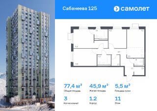 Строим кварталы для жизни с заботой о будущем. Предлагается 3-комнатная квартира комфорт-класса 77,4 кв.м в корпусе 1.2 на 11 этаже, в ЖК "Сабанеева 125"