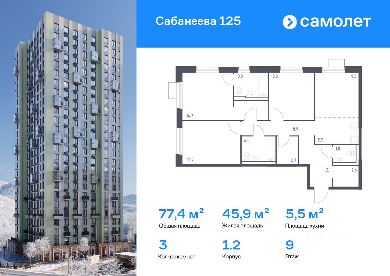 Строим кварталы для жизни с заботой о будущем. Предлагается 3-комнатная квартира комфорт-класса 77,4 кв.м в корпусе 1.2 на 9 этаже, в ЖК "Сабанеева 125"