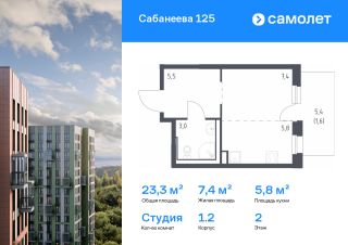 Строим кварталы для жизни с заботой о будущем. Предлагается квартира студия комфорт-класса 23,3 кв.м в корпусе 1.2 на 2 этаже, в ЖК "Сабанеева 125"