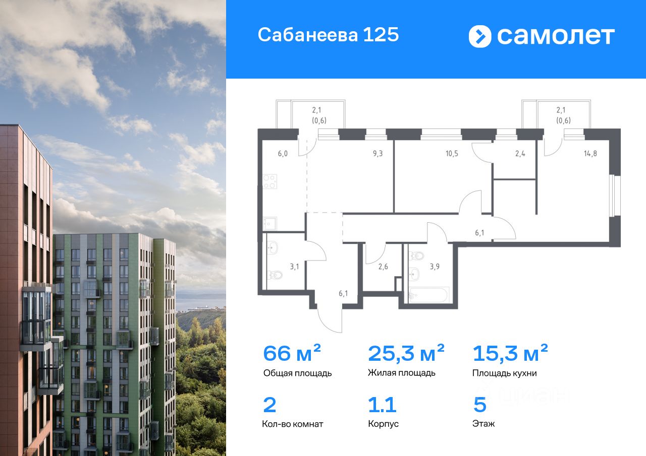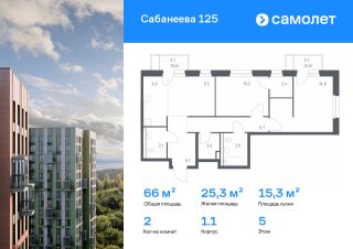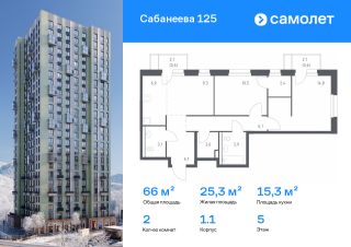 Строим кварталы для жизни с заботой о будущем. Предлагается 2-комнатная квартира комфорт-класса 66 кв.м в корпусе 1.1 на 5 этаже, в ЖК "Сабанеева 125"