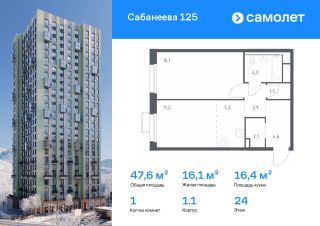 Строим кварталы для жизни с заботой о будущем. Предлагается 1-комнатная квартира комфорт-класса 47,6 кв.м в корпусе 1.1 на 24 этаже, в ЖК "Сабанеева 125"