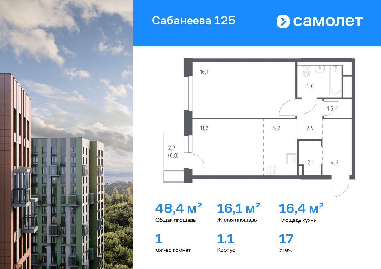 Строим кварталы для жизни с заботой о будущем. Предлагается 1-комнатная квартира комфорт-класса 48,4 кв.м в корпусе 1.1 на 17 этаже, в ЖК "Сабанеева 125"