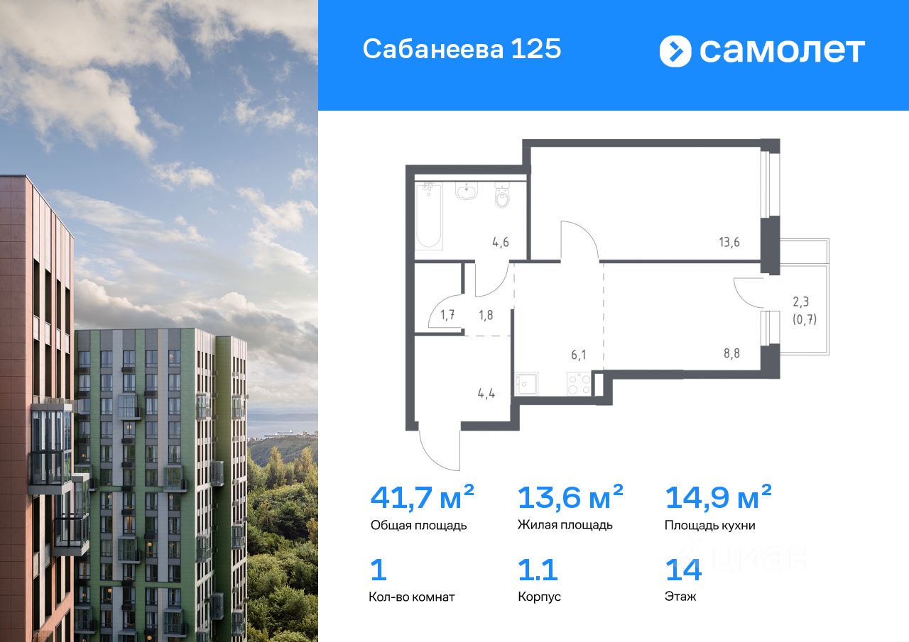 Строим кварталы для жизни с заботой о будущем. Предлагается 1-комнатная квартира комфорт-класса 41,7 кв.м в корпусе 1.1 на 14 этаже, в ЖК "Сабанеева 125"
