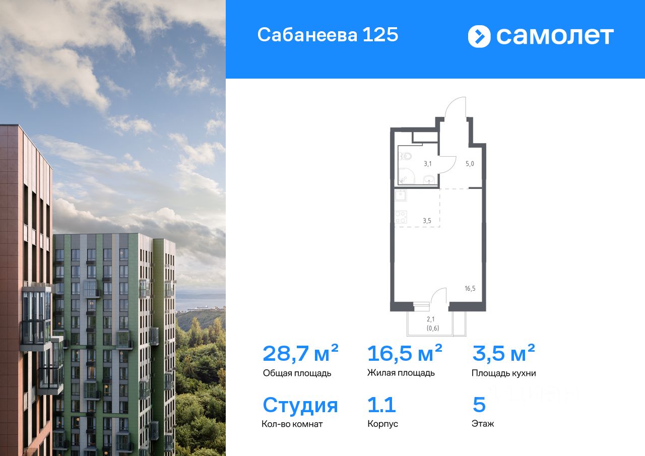 Строим кварталы для жизни с заботой о будущем. Предлагается квартира студия комфорт-класса 28,7 кв.м в корпусе 1.1 на 5 этаже, в ЖК "Сабанеева 125"