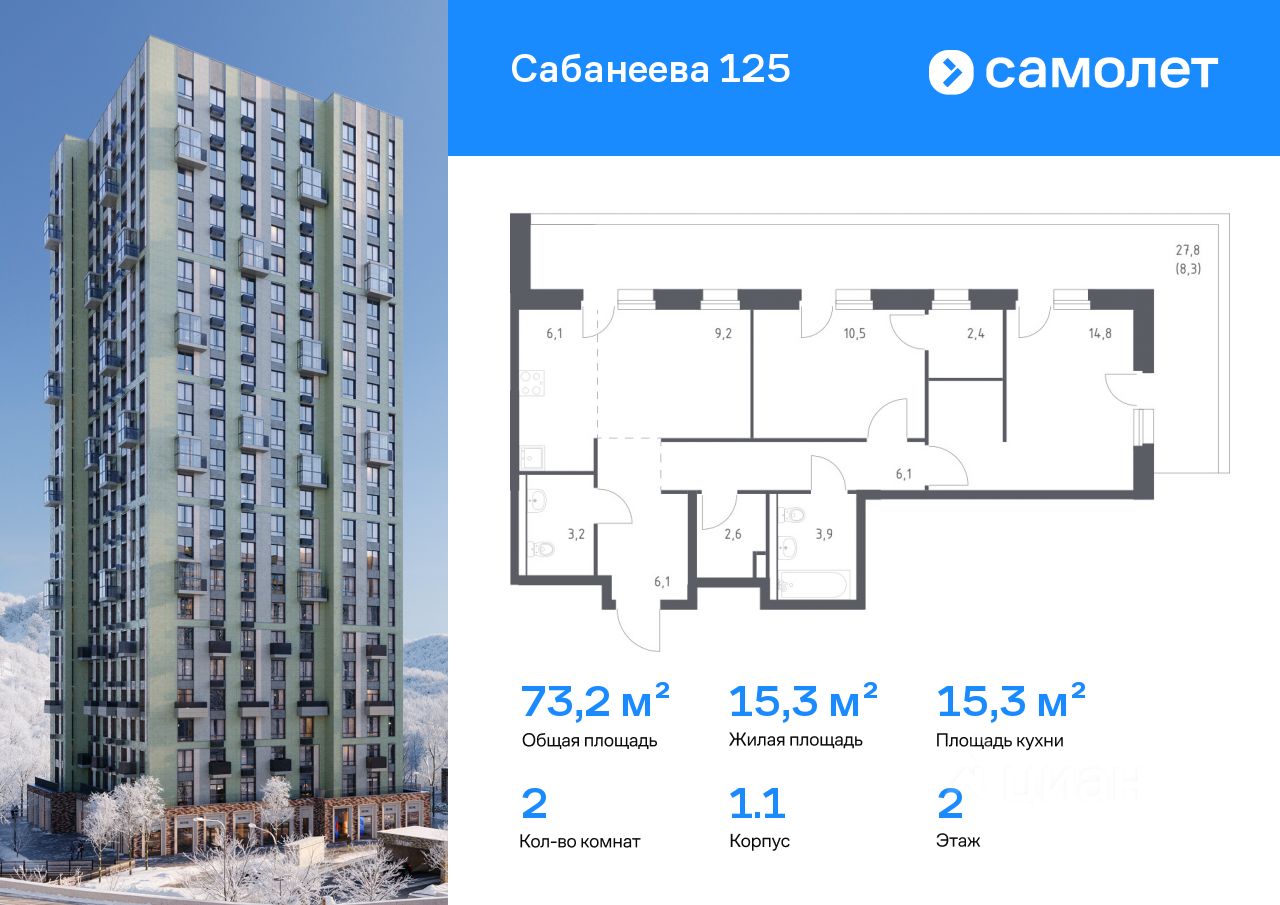 Строим кварталы для жизни с заботой о будущем. Предлагается 2-комнатная квартира комфорт-класса 73,2 кв.м в корпусе 1.1 на 2 этаже, в ЖК "Сабанеева 125"