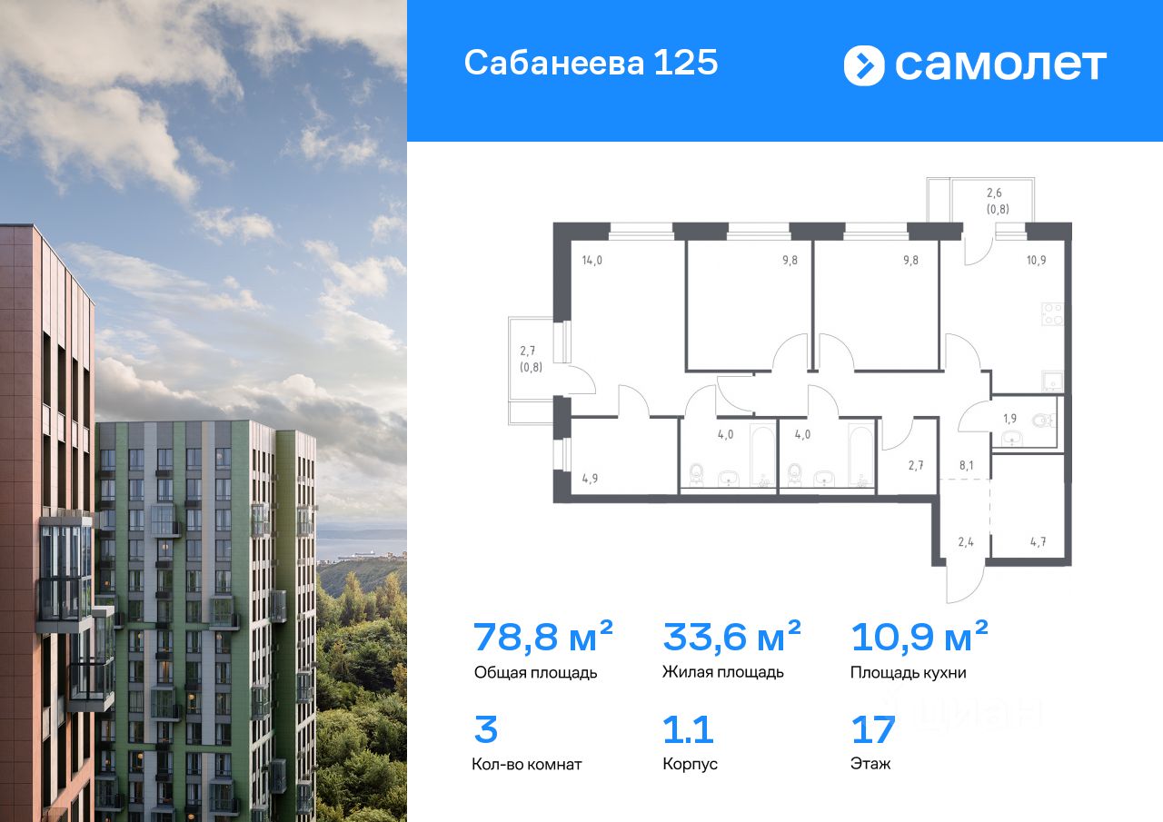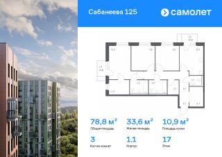 Строим кварталы для жизни с заботой о будущем. Предлагается 3-комнатная квартира комфорт-класса 78,8 кв.м в корпусе 1.1 на 17 этаже, в ЖК "Сабанеева 125"