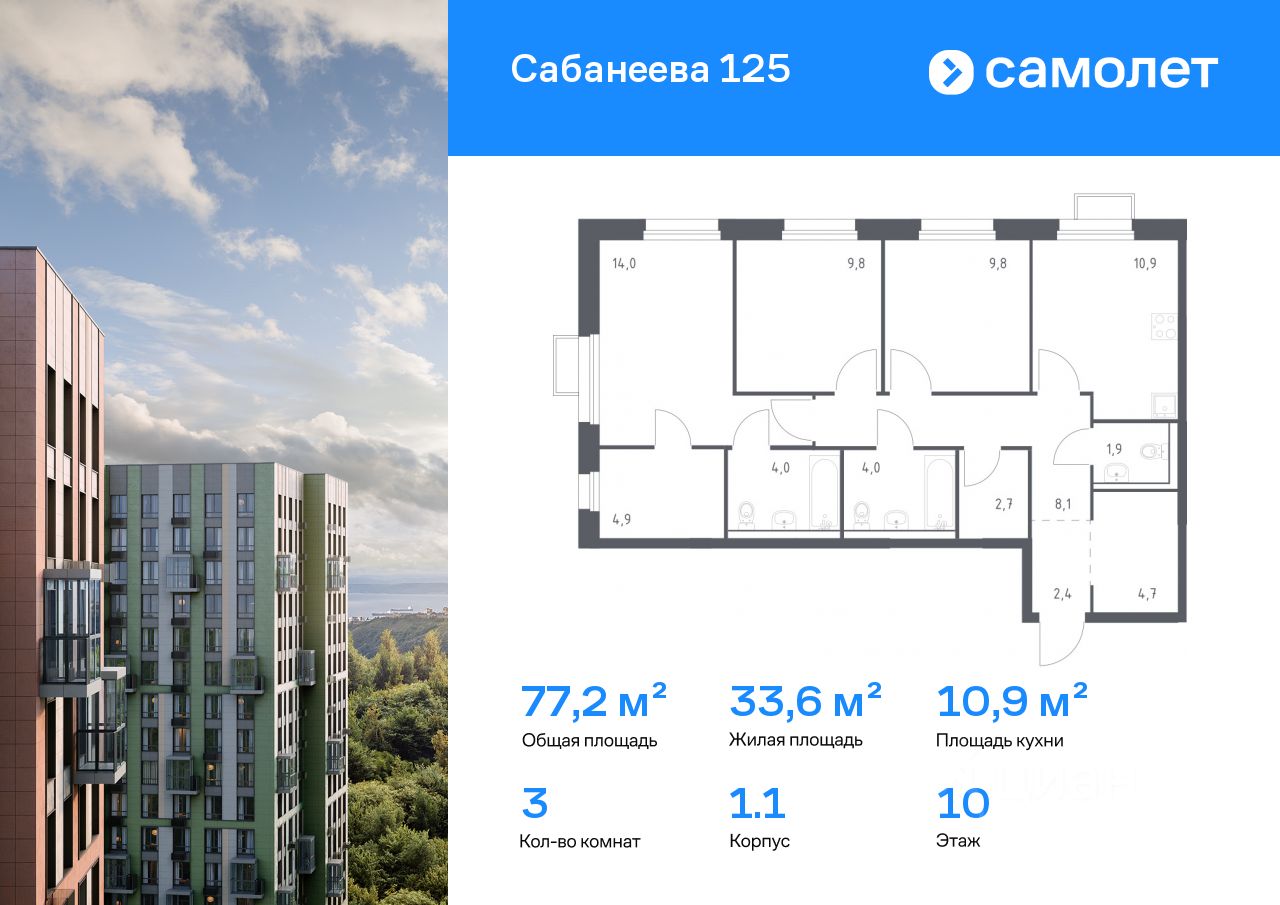Строим кварталы для жизни с заботой о будущем. Предлагается 3-комнатная квартира комфорт-класса 77,2 кв.м в корпусе 1.1 на 10 этаже, в ЖК "Сабанеева 125"