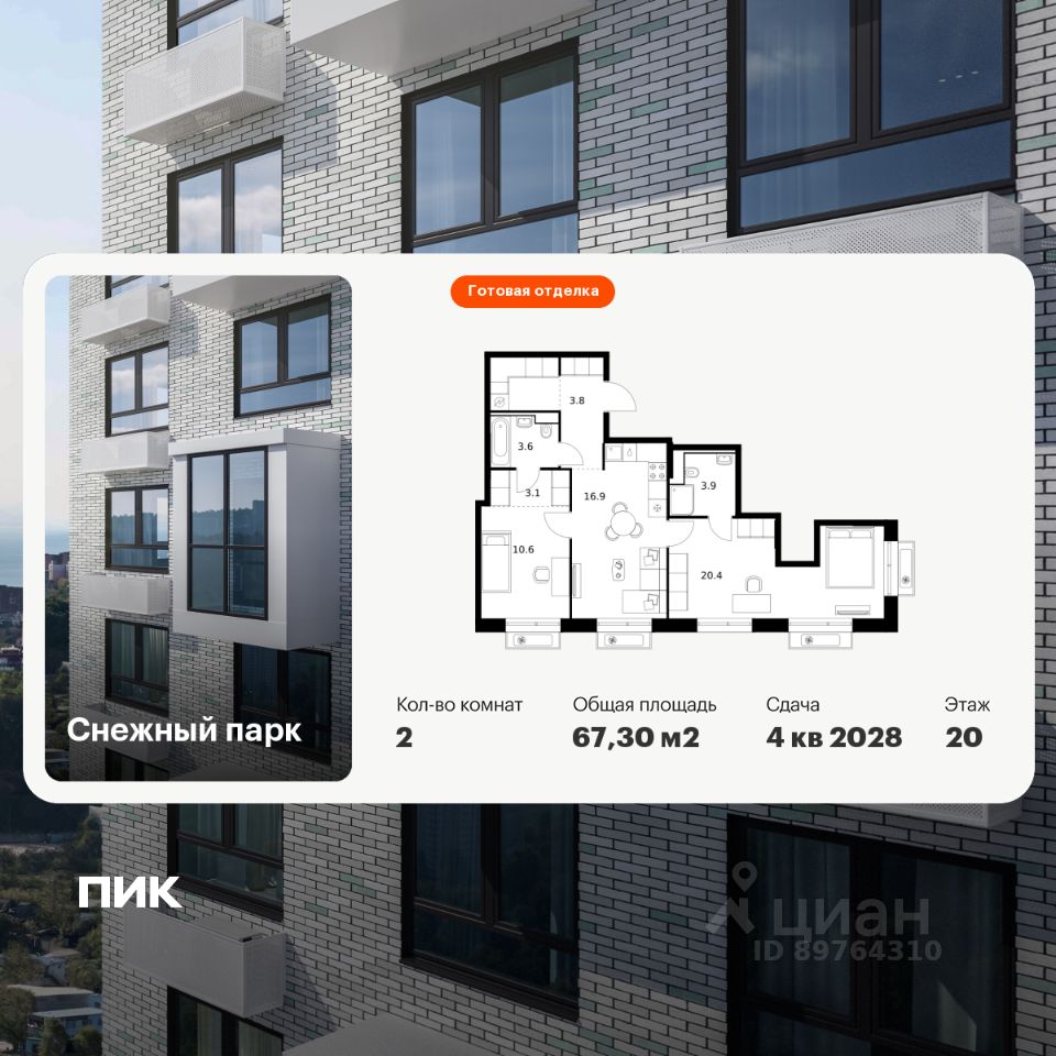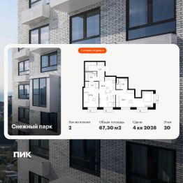 Продаётся 2-комн. квартира площадью 67,3 кв.м на 20 этаже 25 этажного дома (Корпус 4, Секция 2) проекта ПИК Снежный парк. Светлый просторный подъезд на уровне земли, функциональная планировка, большие окна, c отделкой.