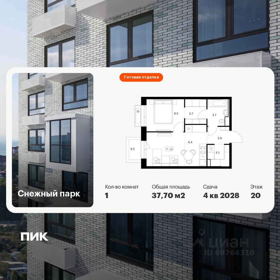 Продаётся 1-комн. квартира площадью 37,7 кв.м на 20 этаже 25 этажного дома (Корпус 4, Секция 2) проекта ПИК Снежный парк. Светлый просторный подъезд на уровне земли, функциональная планировка, большие окна, c отделкой.
