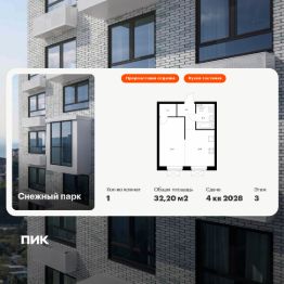 Продаётся 1-комн. квартира площадью 32,2 кв.м на 3 этаже 25 этажного дома (Корпус 3, Секция 1) проекта ПИК Снежный парк. Светлый просторный подъезд на уровне земли, функциональная планировка, большие окна, предчистовая отделка.