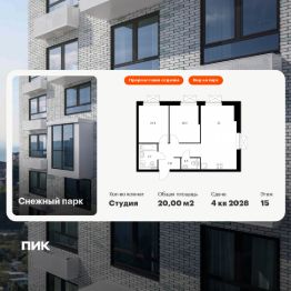 Продаётся квартира-студия площадью 20 кв.м на 15 этаже 25 этажного дома (Корпус 3, Секция 1) проекта ПИК Снежный парк. Светлый просторный подъезд на уровне земли, функциональная планировка, большие окна, предчистовая отделка.