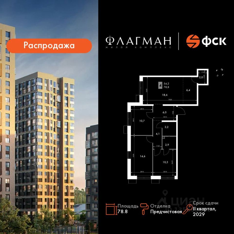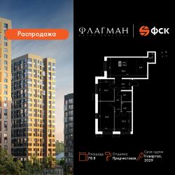 Продаётся 4-к квартира номер 120 общей площадью 78.8 кв.м. на 11-м этаже 30 этажного здания. Отделка Whitebox. Цена с учётом скидки.