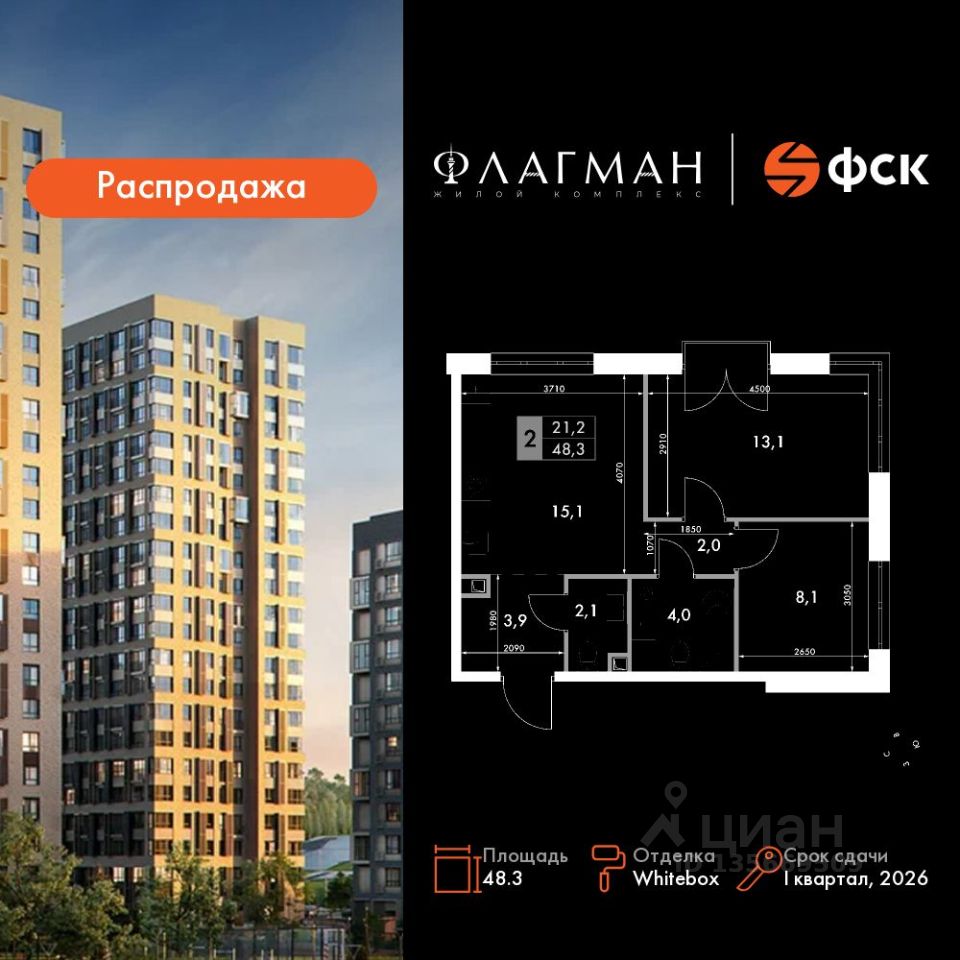 Продаётся 2-к квартира номер 382 общей площадью 48.3 кв.м. на 10-м этаже 22 этажного здания. Отделка Whitebox. Цена с учётом скидки.