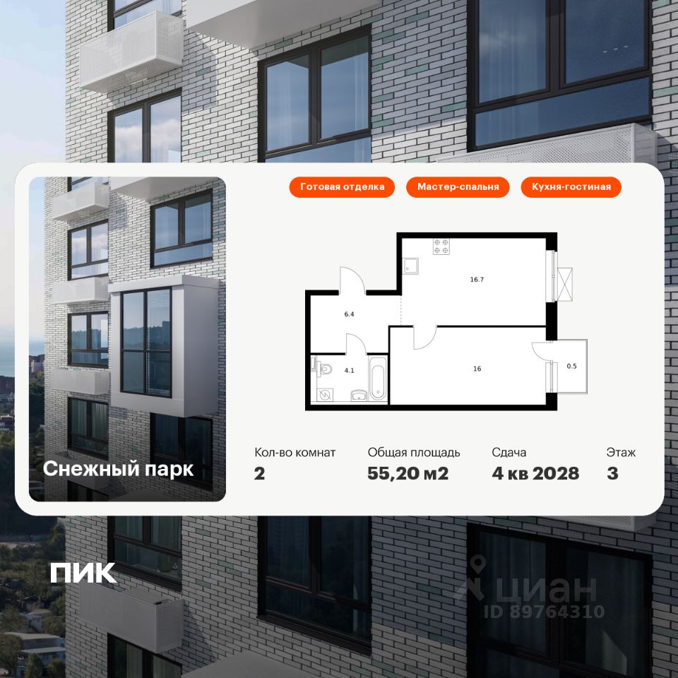 Продаётся 2-комн. квартира площадью 55,2 кв.м на 3 этаже 25 этажного дома (Корпус 4, Секция 2) проекта ПИК Снежный парк. Светлый просторный подъезд на уровне земли, функциональная планировка, большие окна, c отделкой.