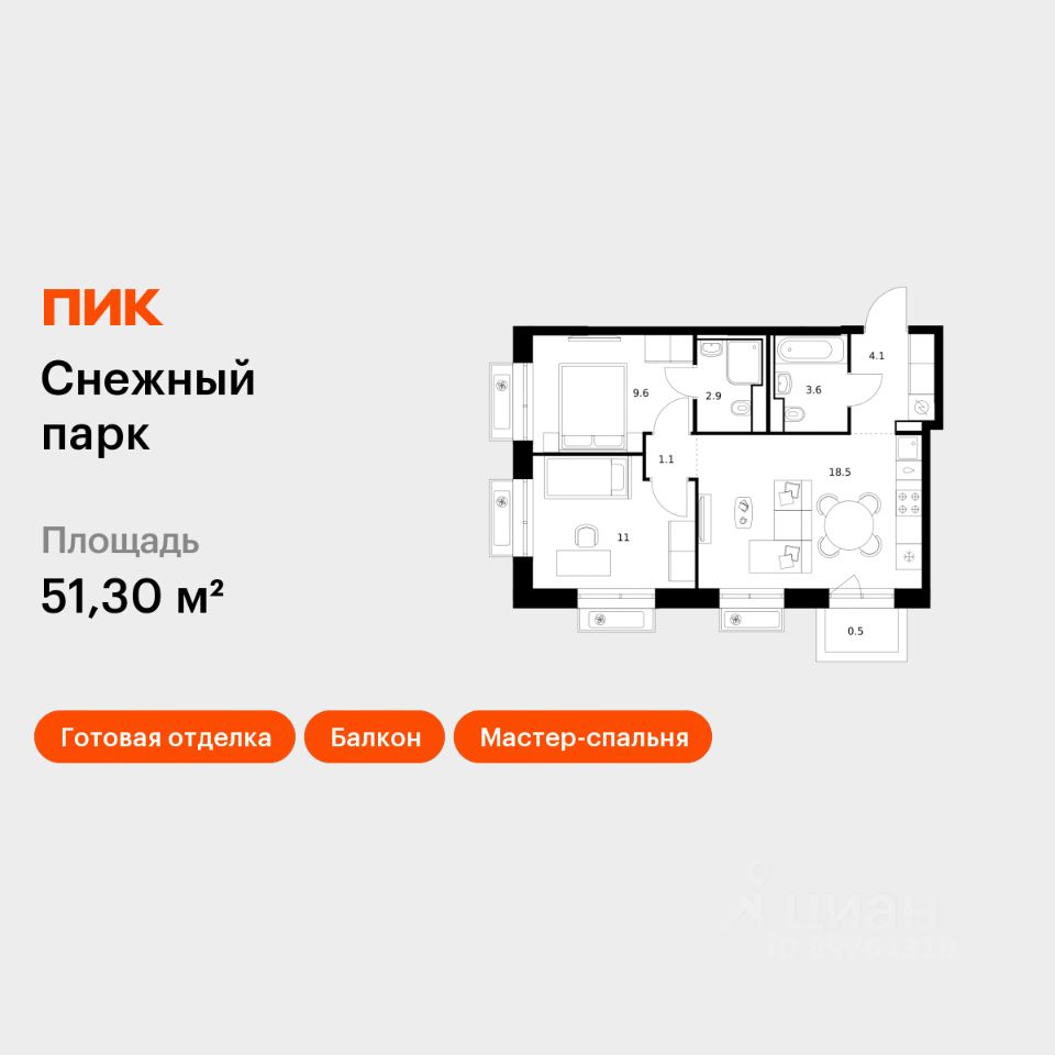 Продаётся 2-комн. квартира площадью 51,3 кв.м на 13 этаже 25 этажного дома (Корпус 4, Секция 2) проекта ПИК Снежный парк. Светлый просторный подъезд на уровне земли, функциональная планировка, большие окна, c отделкой.