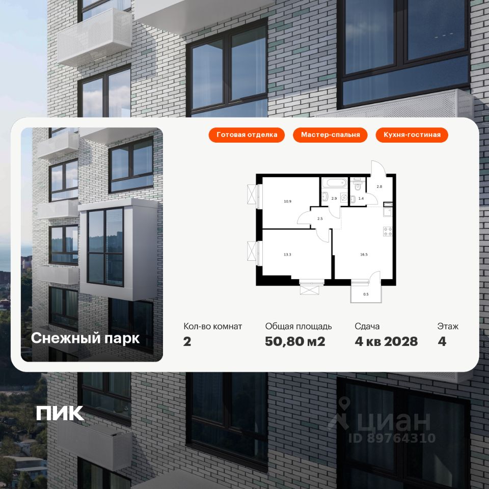 Продаётся 2-комн. квартира площадью 50,8 кв.м на 4 этаже 25 этажного дома (Корпус 4, Секция 2) проекта ПИК Снежный парк. Светлый просторный подъезд на уровне земли, функциональная планировка, большие окна, c отделкой.