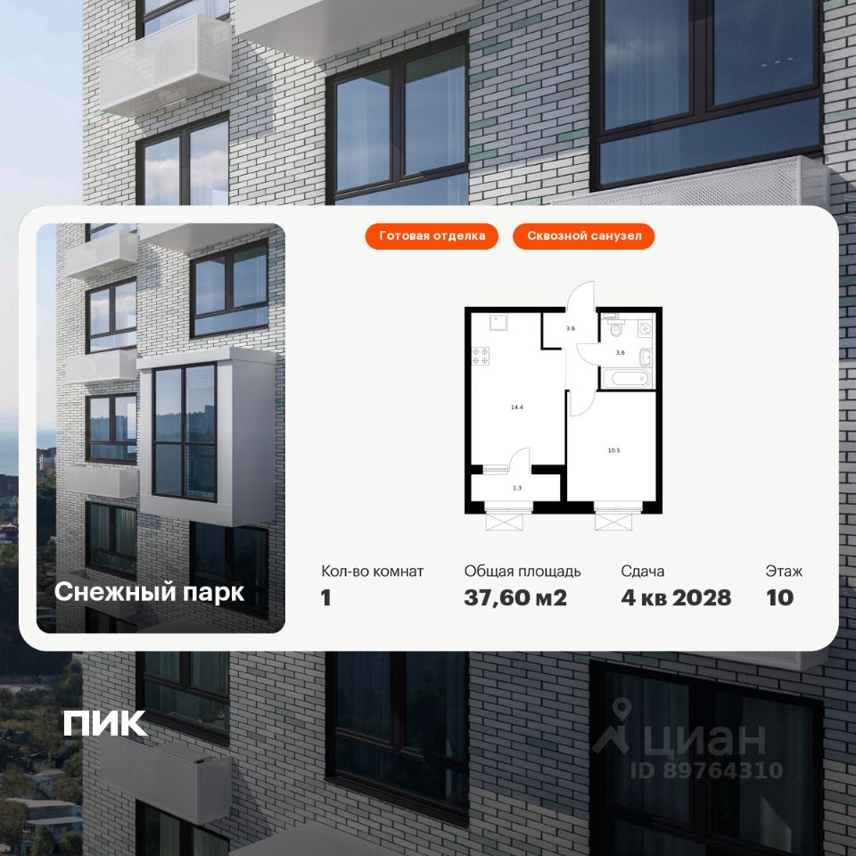 Продаётся 1-комн. квартира площадью 37,6 кв.м на 10 этаже 25 этажного дома (Корпус 4, Секция 2) проекта ПИК Снежный парк. Светлый просторный подъезд на уровне земли, функциональная планировка, большие окна, c отделкой.