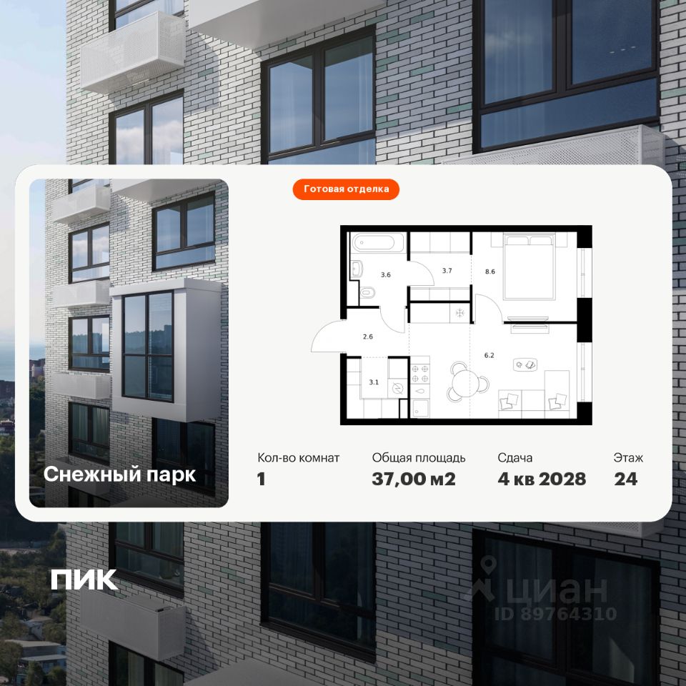 Продаётся 1-комн. квартира площадью 37 кв.м на 24 этаже 25 этажного дома (Корпус 4, Секция 2) проекта ПИК Снежный парк. Светлый просторный подъезд на уровне земли, функциональная планировка, большие окна, c отделкой.