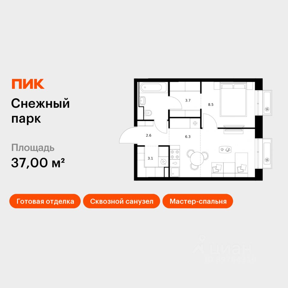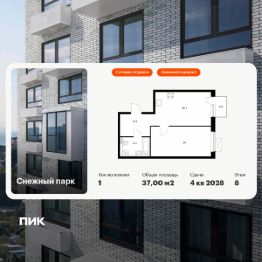 Продаётся 1-комн. квартира площадью 37 кв.м на 8 этаже 25 этажного дома (Корпус 4, Секция 2) проекта ПИК Снежный парк. Светлый просторный подъезд на уровне земли, функциональная планировка, большие окна, c отделкой.