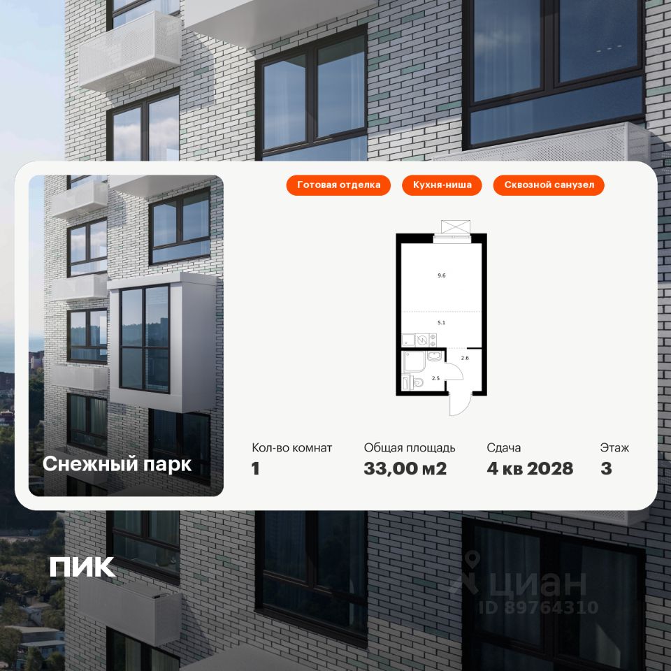 Продаётся 1-комн. квартира площадью 33 кв.м на 3 этаже 25 этажного дома (Корпус 4, Секция 2) проекта ПИК Снежный парк. Светлый просторный подъезд на уровне земли, функциональная планировка, большие окна, c отделкой.