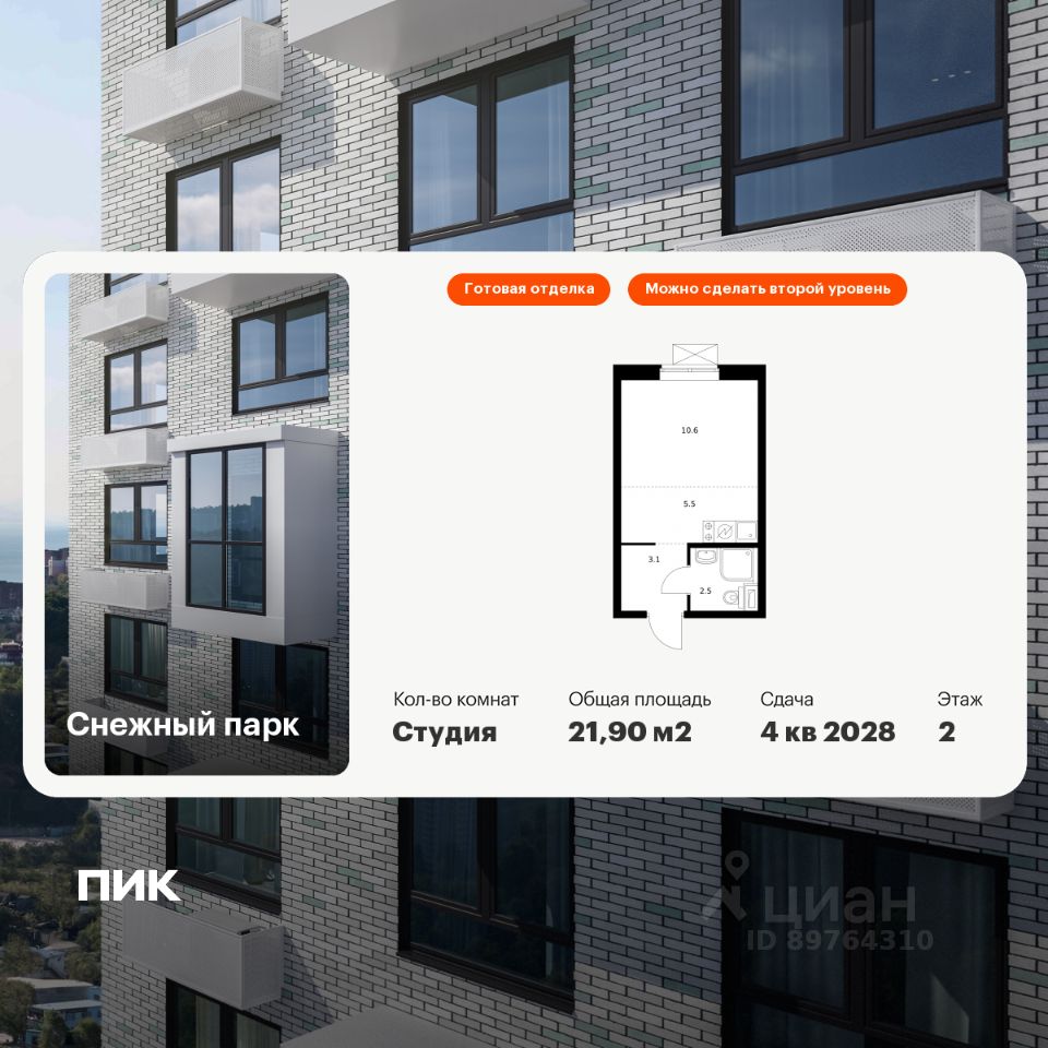 Продаётся квартира-студия площадью 21,9 кв.м на 2 этаже 25 этажного дома (Корпус 4, Секция 2) проекта ПИК Снежный парк. Светлый просторный подъезд на уровне земли, функциональная планировка, большие окна, c отделкой.