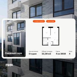 Продаётся квартира-студия площадью 22,2 кв.м на 4 этаже 25 этажного дома (Корпус 4, Секция 2) проекта ПИК Снежный парк. Светлый просторный подъезд на уровне земли, функциональная планировка, большие окна, c отделкой.