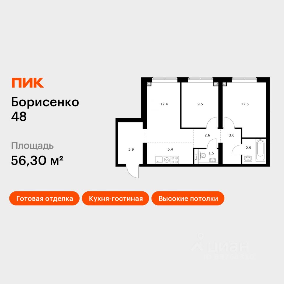 Продаётся 2-комн. квартира площадью 56,3 кв.м на 2 этаже 30 этажного дома (Корпус 4, Секция 4) проекта ПИК Борисенко 48. Светлый просторный подъезд на уровне земли, функциональная планировка, большие окна, c отделкой.