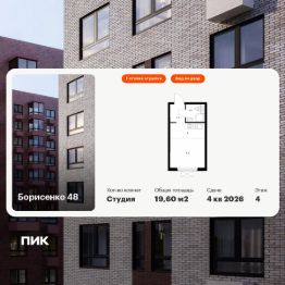 Продаётся квартира-студия площадью 19,6 кв.м на 4 этаже 17 этажного дома (Корпус 1, Секция 1) проекта ПИК Борисенко 48. Светлый просторный подъезд на уровне земли, функциональная планировка, большие окна, c отделкой.