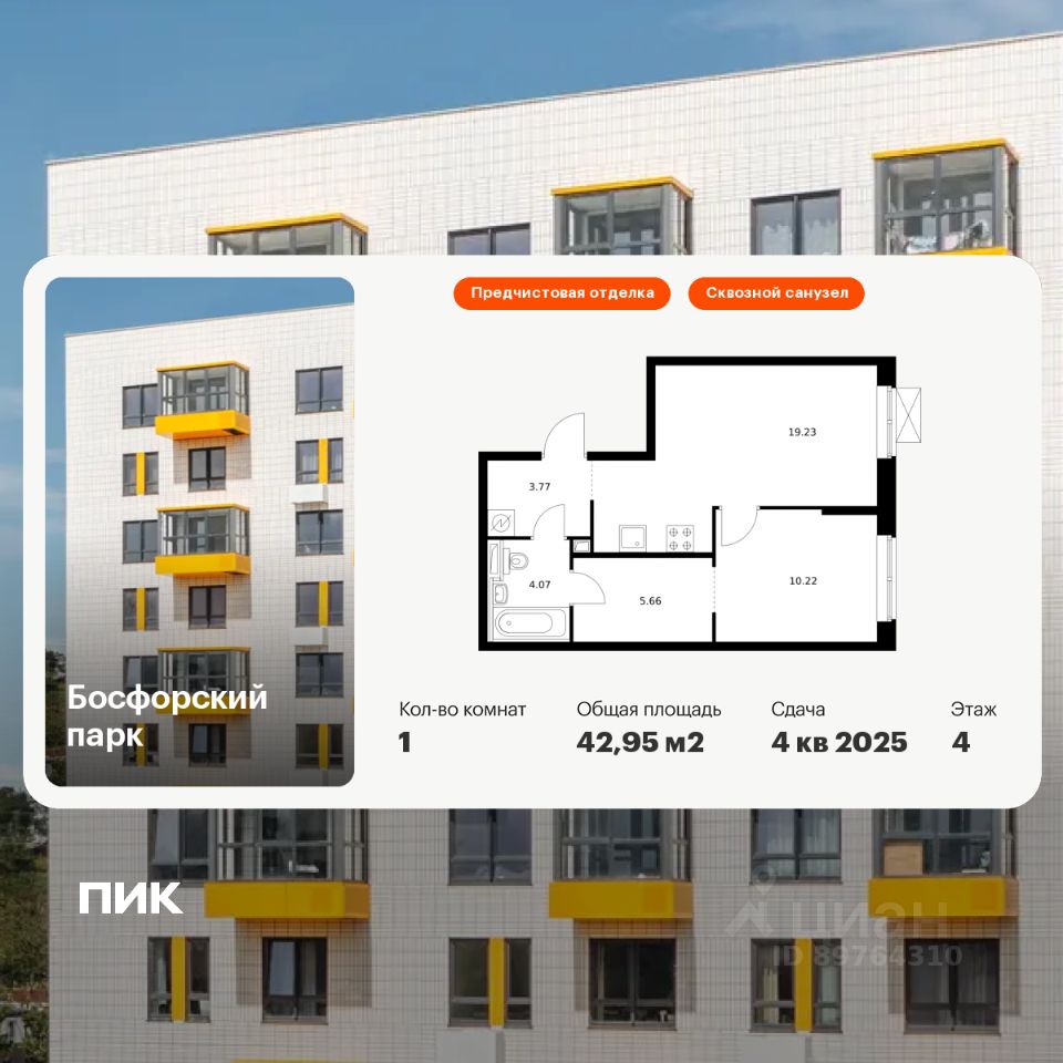 Продаётся 1-комн. квартира площадью 42,95 кв.м на 4 этаже 17 этажного дома (Корпус 7, Секция 1) проекта ПИК Босфорский парк. Светлый просторный подъезд на уровне земли, функциональная планировка, большие окна, предчистовая отделка.