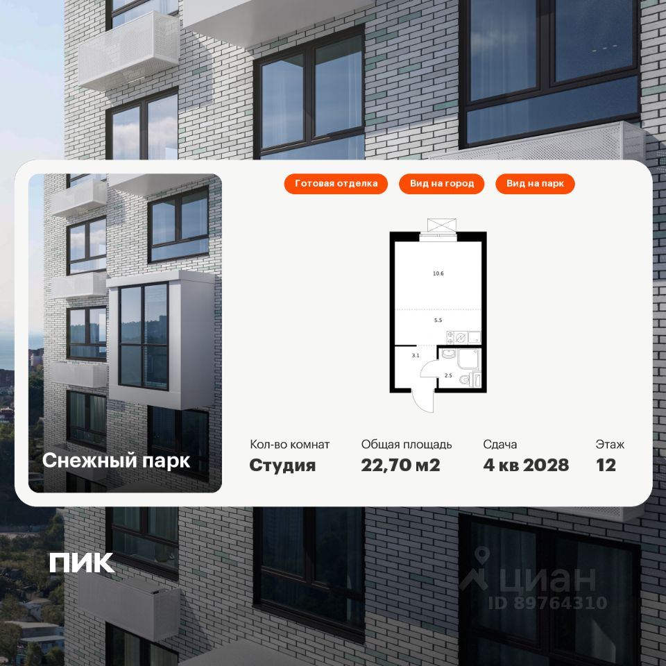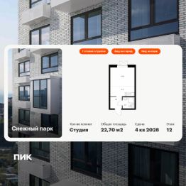 Продаётся квартира-студия площадью 22,7 кв.м на 12 этаже 25 этажного дома (Корпус 4, Секция 2) проекта ПИК Снежный парк. Светлый просторный подъезд на уровне земли, функциональная планировка, большие окна, c отделкой.