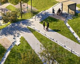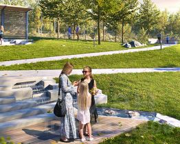 В квартале будет много мест для отдыха и активных игр, три вида парков и даже родник, который будет перетекать в ручей с порогами и препятствиями. На территории парков появятся амфитеатры и террасы. Здесь жители смогут отдыхать, гулять, общаться, учиться или работать на свежем воздухе. На естественных склонах будут обустроены игровые зоны для детей - с горками, сетками, канатами и скалолазными зацепами.
