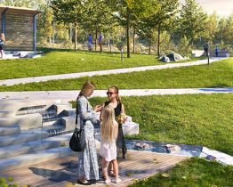 В квартале будет много мест для отдыха и активных игр, три вида парков и даже родник, который будет перетекать в ручей с порогами и препятствиями. На территории парков появятся амфитеатры и террасы. Здесь жители смогут отдыхать, гулять, общаться, учиться или работать на свежем воздухе. На естественных склонах будут обустроены игровые зоны для детей - с горками, сетками, канатами и скалолазными зацепами.