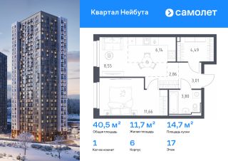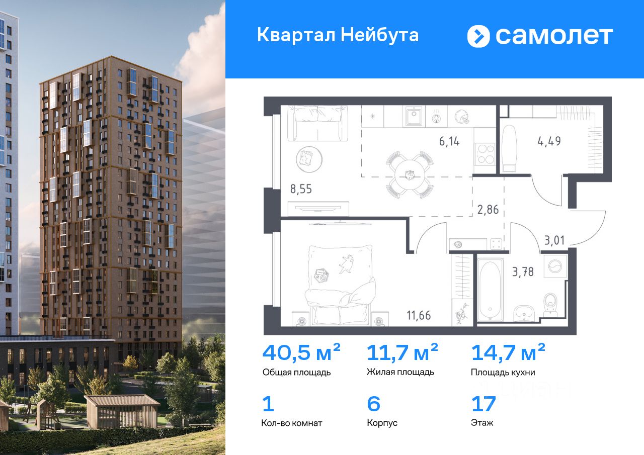 Строим кварталы для жизни с заботой о будущем. Предлагается 1-комнатная квартира комфорт-класса 40,51 кв.м в корпусе 6 на 17 этаже, в ЖК "Квартал Нейбута"