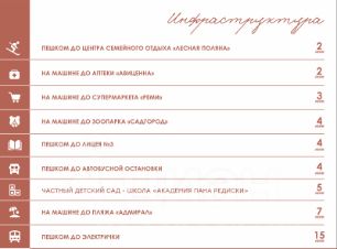 Благоустройство позволяет устроить барбекю, посетить грязевое спа, заняться спортом в фитнес-клубе, реализовать художественные замыслы в творческих студиях или погрузиться в работу в пространствах для коворкинга. Благодаря расположению вблизи "Лесной поляны" есть возможность в полной мере насладиться зимними видами спорта: катанием на лыжах, сноуборде, коньках.