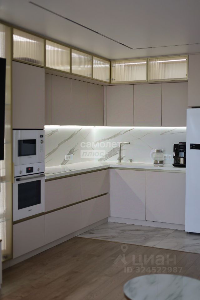 Кулинарное Искусство: Кухня — мечта шеф-повара: кухонный стол из керамогранита с четырьмя стульями, встроенная мебель с фурнитурой Blum, духовой шкаф и СВЧ-печь Bosch, индукционная варочная панель, большой двухдверный холодильник, кофемашина и посудомоечная машина со смарт-управлением.