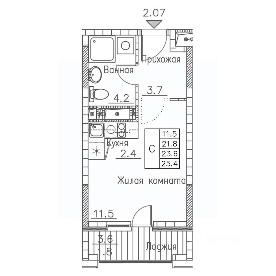 Общая площадь квартиры — 25.4 кв. м, этаж 16 из 19.