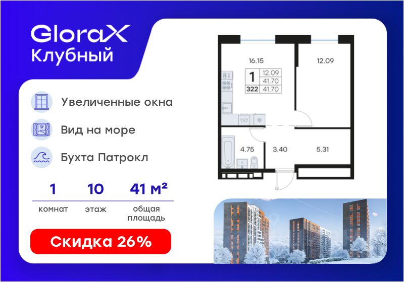 Продается 1-комн. квартира на 10-м этаже в квартале GloraX Клубный. GloraX Клубный - уникальный видовой проект с выделяющейся архитектурой в развитом районе Владивостока. Общая площадь лота составляет 41,70 кв. м, из которых 12,09 кв. м отведено под жилую и 16,15 кв. м под кухонную зону. Номер квартиры - 322.