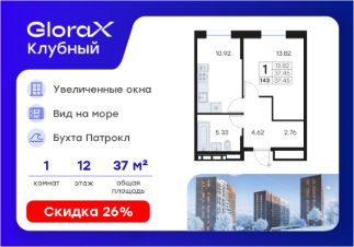 Продается 1-комн. квартира на 12-м этаже в квартале GloraX Клубный. GloraX Клубный - уникальный видовой проект с выделяющейся архитектурой в развитом районе Владивостока. Общая площадь лота составляет 37,45 кв. м, из которых 13,82 кв. м отведено под жилую и 10,92 кв. м под кухонную зону. Номер квартиры - 143.
