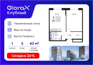 Продается 1-комн. квартира на 3-м этаже в квартале GloraX Клубный. GloraX Клубный - уникальный видовой проект с выделяющейся архитектурой в развитом районе Владивостока. Общая площадь лота составляет 43,88 кв. м, из которых 16,04 кв. м отведено под жилую и 16,42 кв. м под кухонную зону. Номер квартиры - 230.