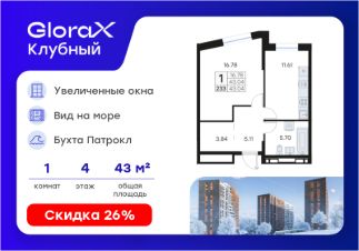 Продается 1-комн. квартира на 4-м этаже в квартале GloraX Клубный. GloraX Клубный - уникальный видовой проект с выделяющейся архитектурой в развитом районе Владивостока. Общая площадь лота составляет 43,04 кв. м, из которых 16,78 кв. м отведено под жилую и 11,61 кв. м под кухонную зону. Номер квартиры - 233.
