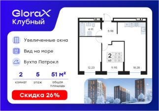 Продается 2-комн. квартира на 5-м этаже в квартале GloraX Клубный. GloraX Клубный - уникальный видовой проект с выделяющейся архитектурой в развитом районе Владивостока. Общая площадь лота составляет 51,35 кв. м, из которых 22,18 кв. м отведено под жилую и 18,28 кв. м под кухонную зону. Номер квартиры - 60.