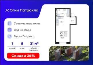 Продается квартира-студия на 8-м этаже в проекте Огни Патрокла от GloraX. Огни Патрокла - уникальный видовой проект с выделяющейся архитектурой в развитом районе Владивостока. Общая площадь лота составляет 31,12 кв. м, из которых 18,21 кв. м отведено под жилую и 4,25 кв. м под кухонную зону. Номер квартиры - 294.