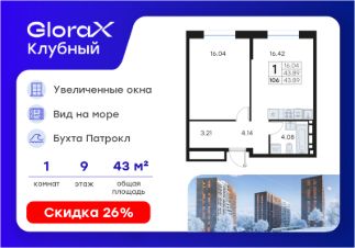 Продается 1-комн. квартира на 9-м этаже в квартале GloraX Клубный. GloraX Клубный - уникальный видовой проект с выделяющейся архитектурой в развитом районе Владивостока. Общая площадь лота составляет 43,89 кв. м, из которых 16,04 кв. м отведено под жилую и 16,42 кв. м под кухонную зону. Номер квартиры - 106.