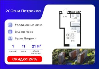Продается квартира-студия на 11-м этаже в проекте Огни Патрокла от GloraX. Огни Патрокла - уникальный видовой проект с выделяющейся архитектурой в развитом районе Владивостока. Общая площадь лота составляет 21,87 кв. м, из которых 8,98 кв. м отведено под жилую и 2,25 кв. м под кухонную зону. Номер квартиры - 110.