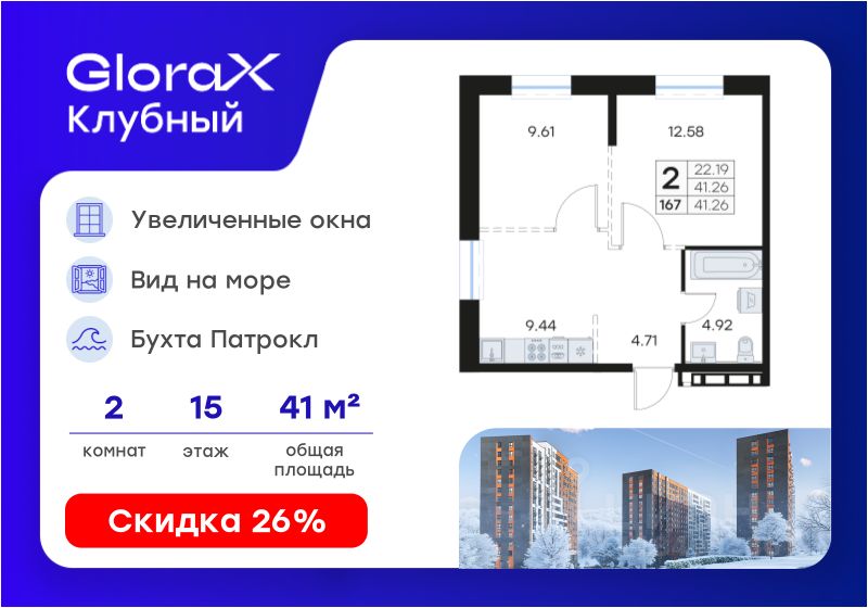Продается 2-комн. квартира на 15-м этаже в квартале GloraX Клубный. GloraX Клубный - уникальный видовой проект с выделяющейся архитектурой в развитом районе Владивостока. Общая площадь лота составляет 41,26 кв. м, из которых 22,19 кв. м отведено под жилую и 9,44 кв. м под кухонную зону. Номер квартиры - 167.