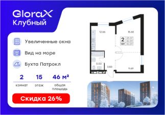 Продается 2-комн. квартира на 15-м этаже в квартале GloraX Клубный. GloraX Клубный - уникальный видовой проект с выделяющейся архитектурой в развитом районе Владивостока. Общая площадь лота составляет 46,59 кв. м, из которых 25,37 кв. м отведено под жилую и 12,66 кв. м под кухонную зону. Номер квартиры - 159.