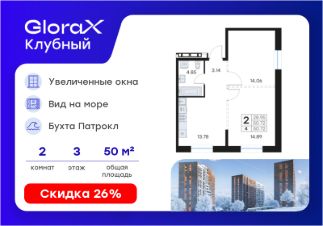 Продается 2-комн. квартира на 3-м этаже в квартале GloraX Клубный. GloraX Клубный - уникальный видовой проект с выделяющейся архитектурой в развитом районе Владивостока. Общая площадь лота составляет 50,72 кв. м, из которых 28,95 кв. м отведено под жилую и 13,78 кв. м под кухонную зону. Номер квартиры - 4.