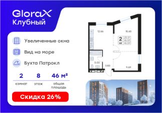 Продается 2-комн. квартира на 8-м этаже в квартале GloraX Клубный. GloraX Клубный - уникальный видовой проект с выделяющейся архитектурой в развитом районе Владивостока. Общая площадь лота составляет 46,59 кв. м, из которых 25,37 кв. м отведено под жилую и 12,66 кв. м под кухонную зону. Номер квартиры - 68. Преимущества квартиры: двухкомнатная квартира; угловая. Преимущества проекта: • Квартиры с панорамными видами на бухту Патрокл, маяк Басаргина и остров Русский • Планировочные решения под любой жизненный сценарий от 23 до 67 м² • Гардеробные комнаты, увеличенные панорамные окна, просторные кухни-гостиные • Эксклюзивное благоустройство: продуманное зонирование, игровые и спортивные площадки, площадка для стритбола, амфитеатр • Премиальный дизайн входных групп с лаунж-зоной • Безбарьерная среда, закрытая территория, видеонаблюдение • Лапомойки, колясочные и туалеты на первом этаже • Двухуровневый подземный паркинг на 350 машино-мест с лифтом на жилые этажи • Келлеры на цокольном этаже для хранения сезонных вещей с доступом на лифте • Современный ландшафтный дизайн комплекса от DEREVOPARK GloraX Клубный заповедник в черте мегаполиса. Комплекс тщательно продуман для максимального удобства и обеспечения безопасности его жителей. Квартал расположен в одном из самых современных развивающихся районов города: совсем рядом раскинулась живописная бухта Патрокл, где можно прогуляться по облагороженной пешеходной набережной, заглянуть на пляж или в школу серфинга. Комплекс имеет прекрасную транспортную доступность: рядом проходит объездная трасса СеданкаПатрокл, а до центар можно доехать всего за 15 минут. Проект включает 3 монолитных корпуса, каждый из которых спроектирован с акцентом на комфорт, безопасность и современный образ жизни рядом с уникальной природой. Общий двор создает приватную территорию для житей комплекса. В комплексе предусмотрен двухуровневый подземный паркинг на 350 машино-мест с доступом прямо с жилых этажей. Паркинг оборудован современными системами видеонаблюдения, контроля въезда-выезда и пожаротушения. На цокольном этаже размещаются келлеры для хранения сезонных и габаритных вещей. Доступ к кладовым на лифте с жилых этажей. Современный ландшафтный дизайн жилого комплекса GloraX Клубный создан ведущей российской студией DEREVOPARK. Во дворе для детей всех возрастов предусмотрены различные игровые площадки с лазалками, батутами, качелями и песочницей. В центре расположен специальный "зеленый остров", где взрослые могут отдохнуть на качелях и гамаках в тени больших деревьев. Для любителей спорта предусмотрены две специальные спортивные площадки для настольного тенниса и стритбола — для зрителей тоже найдется место! А еще на территории комплекса будет дорожка для роллеров и любителей покататься на велосипеде, самокате или скейте. В шаговой доступности располагаются все необходимые объекты социальной и коммерческой инфраструктуры. Цена указана при 100% опла