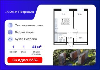 Продается 1-комн. квартира на 1-м этаже в проекте Огни Патрокла от GloraX. Огни Патрокла - уникальный видовой проект с выделяющейся архитектурой в развитом районе Владивостока. Общая площадь лота составляет 41,55 кв. м, из которых 12,36 кв. м отведено под жилую и 17,51 кв. м под кухонную зону. Номер квартиры - 208.